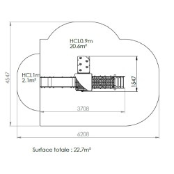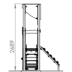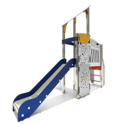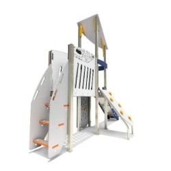 Ensemble composé d'une tour avec un toboggan glissière en INOX, d'un escalier, d'une passerelle rigide, d'un panneau d'escalade vertical avec prise de grimpe