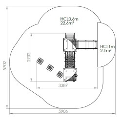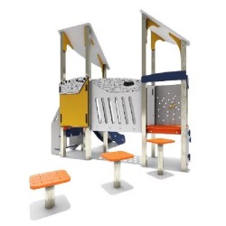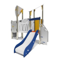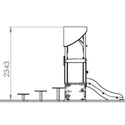 Ensemble composé de 2 tours reliée par une passerelle rigide avec un toboggan à glissière en INOX, d'un escalier, d'une passerelle rigide,