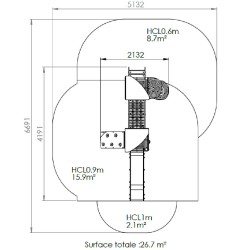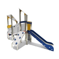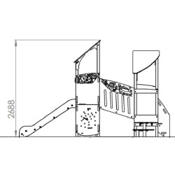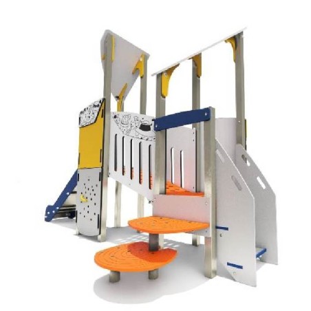 Ensemble composé de 2 tours avec 2 hauteurs e plateformes reliées par une passerelle rigide inclinée avec un toboggan à glissière en INOX, d'un escalier,