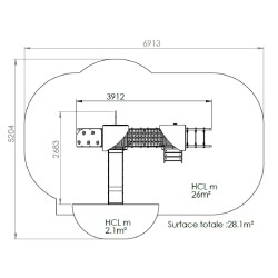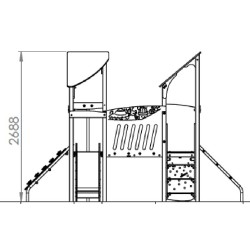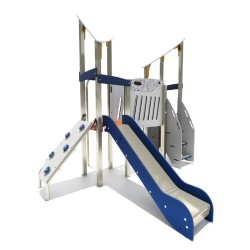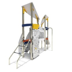 Ensemble composé de 2 tours reliées par une passerelle rigide avec un toboggan à glissière en INOX, d'un escalier, d'une passerelle rigide,