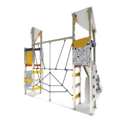 d'une échelle en cordage armé, d'une zone d'assise, d'un panneau d'escalade incliné avec prise de grimpe et d'un panneau de manipulation.