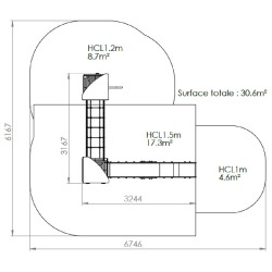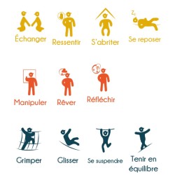 d'une échelle, d'une zone d'assise, d'un panneau d'escalade avec prise de grimpe et d'un panneau de manipulation.