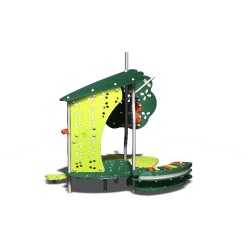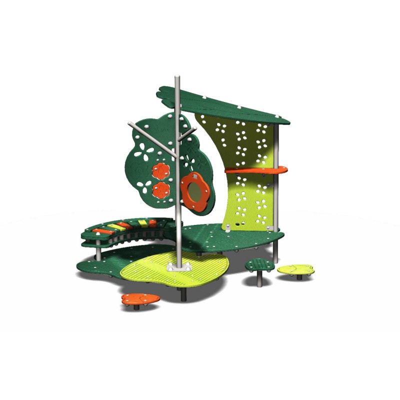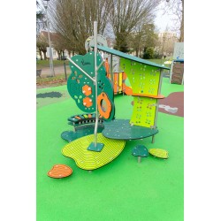 Une structure de jeux pour l'éveil des sens. Avec son Xylophone, son Miroir un Arbre avec fruits à toucher et tourner et une zone d'assise.