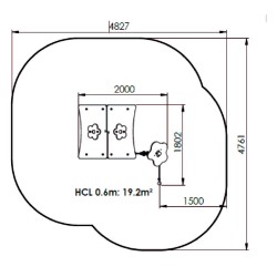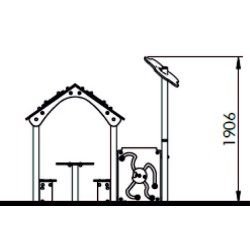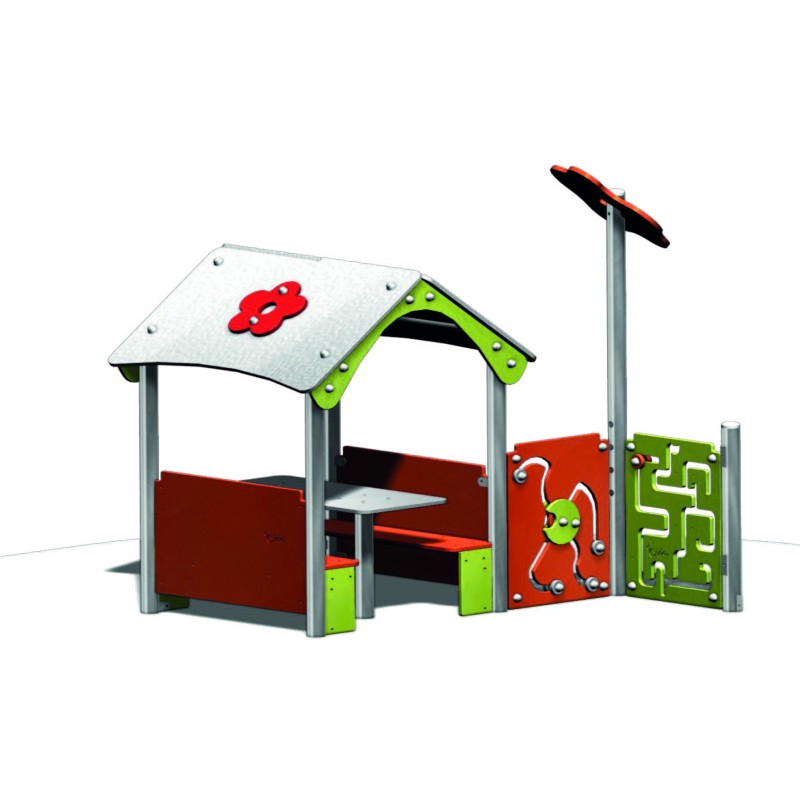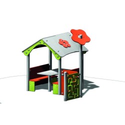 Une structure de jeux avec des éléments de manipulation, une table et 2 assises et 2 panneaux de manipulation.
