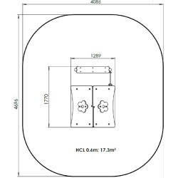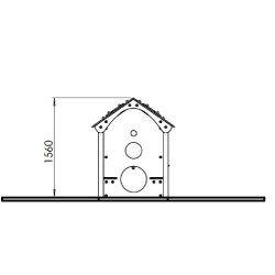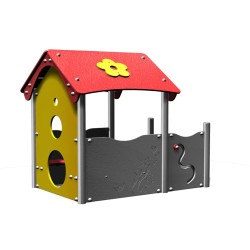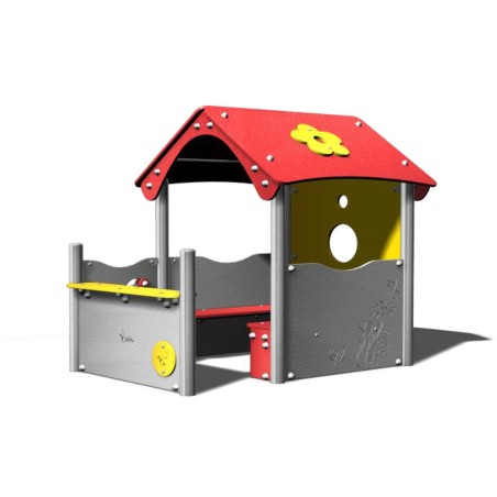 Une structure de jeux pour enfant avec une zone d'assise, un toit et un comptoir.