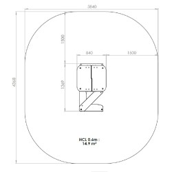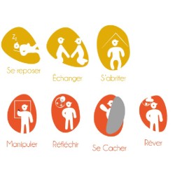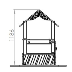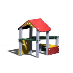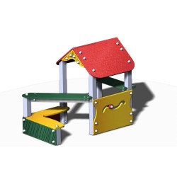 Une structure de jeux avec deux kiosques, 2 zones d'assises et un panneau de manipulation.