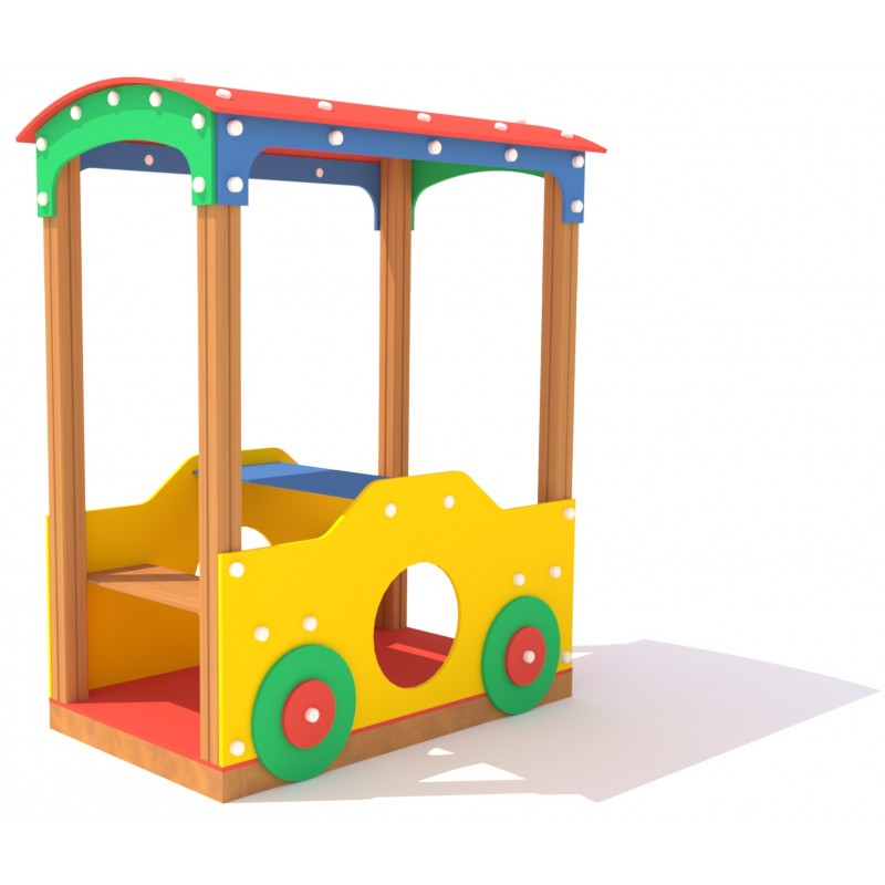 Une structure ludique en forme de wagon de train dans lequel se trouvent une table et deux bancs sous un toit.