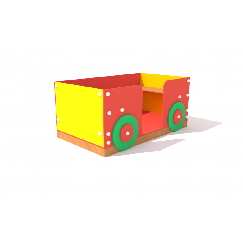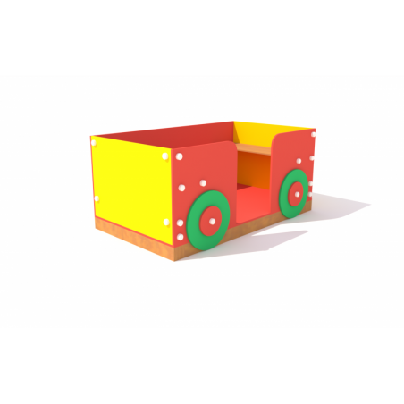 Une structure ludique en forme de wagon de train dans lequel se trouvent deux bancs.