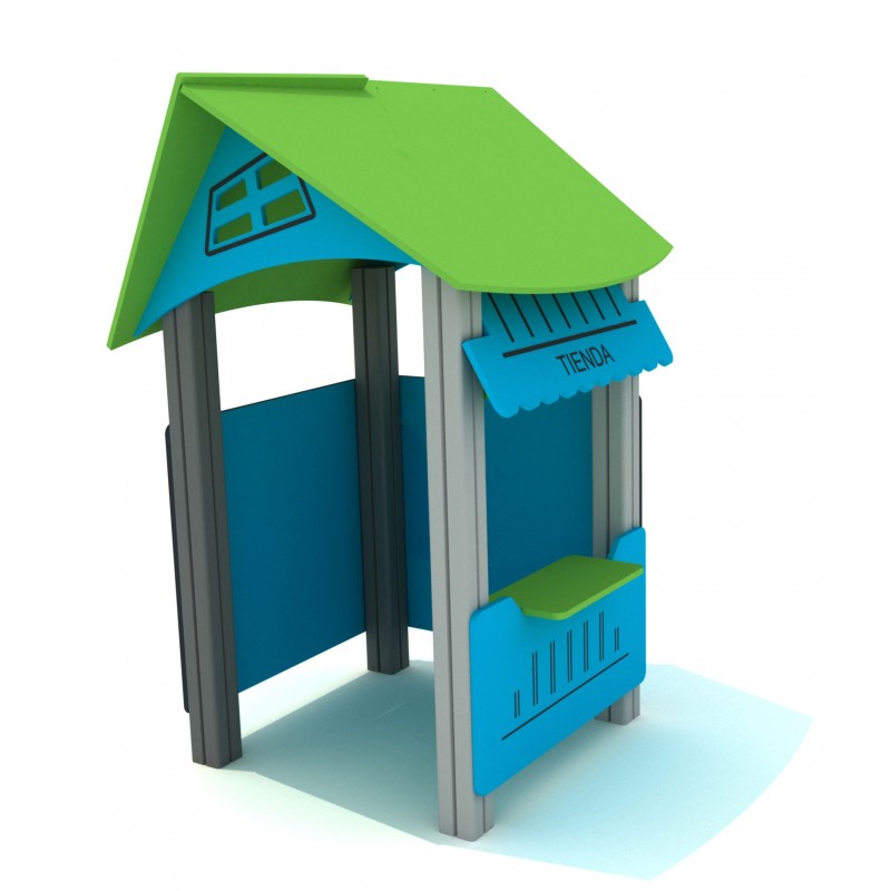Petite structure avec une grande toiture aux 2 pans verts : 2 panneaux ludiques extérieurs et 1 comptoir de magasin.