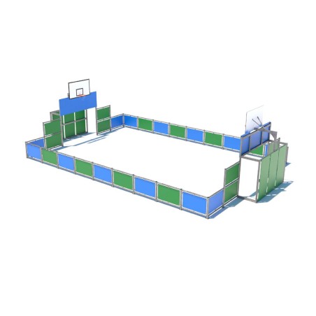 Terrain multi-sports modulaire avec structure principale tubulaire métallique, de section 89 mm et 60 mm, avec cadre de but métallique et panneaux latéraux et arrière en PEHD de 15 mm.