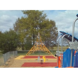 La pyramide de corde, surnommée affectueusement "toile d'araignée" par les enfants, est une structure emblématique des aires de jeux extérieures. Intemporelle et indémodable, elle traverse les générations en conservant son pouvoir d’attraction, séduisant aussi bien les plus jeunes que les plus grands aventuriers.