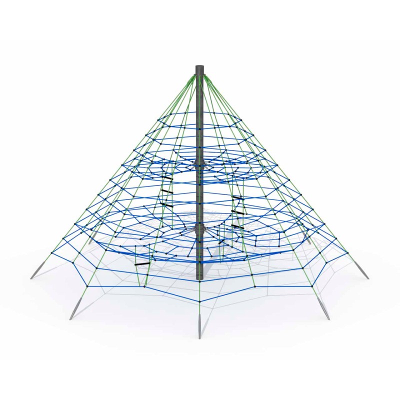 Structure de grimpe toile d'araignée approprié aux enfants de 4 à 16 ans. Le filet est composé de cordage en polypropylène dont les extrémités sont fixées sous-sol avec 8 ancrages galvanisées. Le filet est pendu autour d’un pilier en métal qui est directement ancré dans le sol avec du béton.