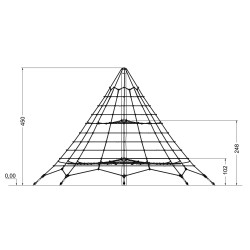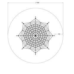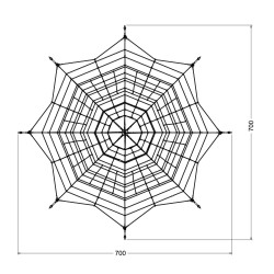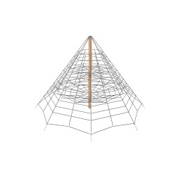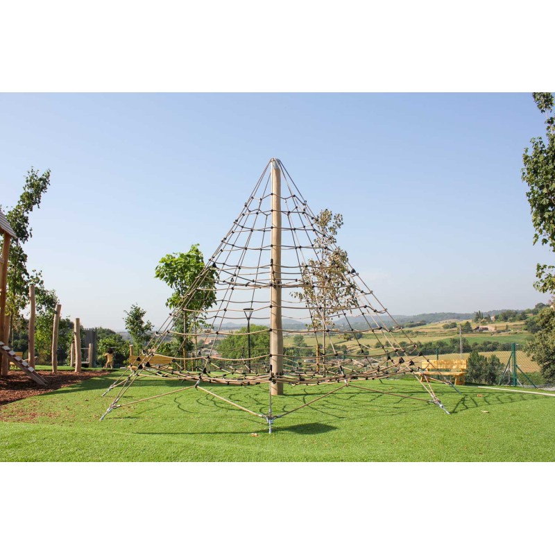 Structure de grimpe toile d'araignée approprié aux enfants de 6 à 16 ans. Le filet est composé de cordage en polypropylène dont les extrémités sont fixées sous-sol avec 8 ancrages en inox. Le filet est pendu autour d’un pilier en bois de robinier qui est directement ancré dans le sol avec du béton.