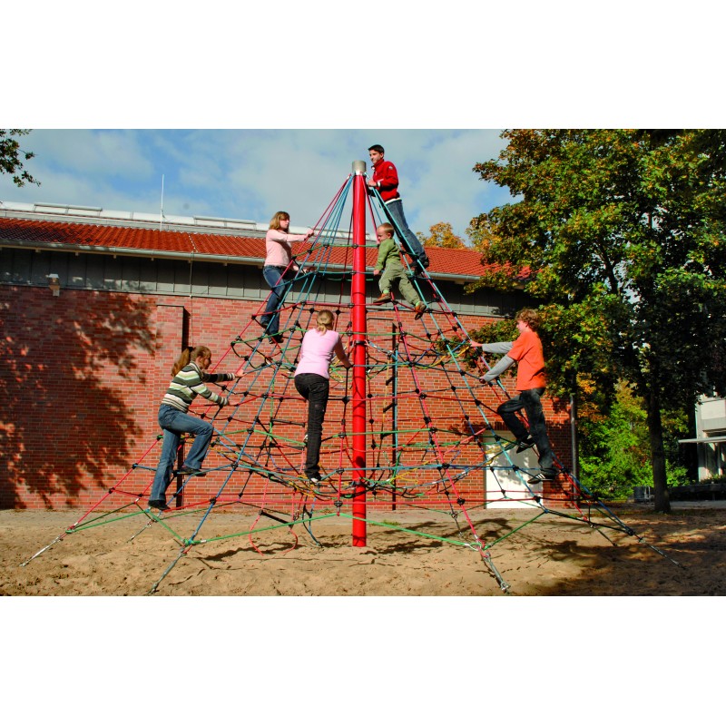 La pyramide de corde, surnommée affectueusement "toile d'araignée" par les enfants, est une structure emblématique des aires de jeux extérieures. Intemporelle et indémodable, elle traverse les générations en conservant son pouvoir d’attraction, séduisant aussi bien les plus jeunes que les plus grands aventuriers.