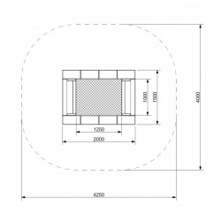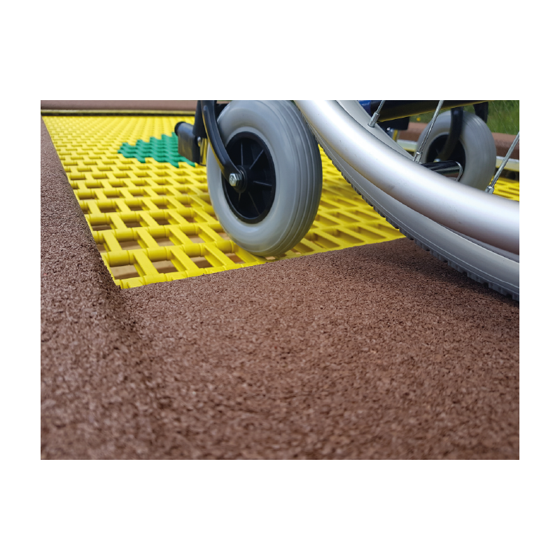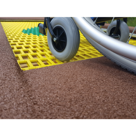 Trampoline de forme rectangulaire destiné à être utilisé sur des aires de jeux à usage intensif disposant d'une rampe d'accès pour fauteuil roulant.