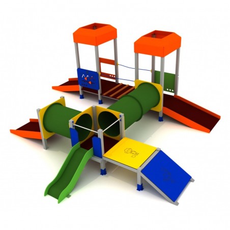 Structure ludique PMR de 2 tours accessibles aux enfants en fauteuil roulant et d’une tourelle. Cette architecture permet de combiner les plaisirs et de partager des histoires autour des parcours: une grande passerelle PMR et son panneau ludique. 2 tunnels. 1 tourelle. des pans inclinés et 1 toboggan.