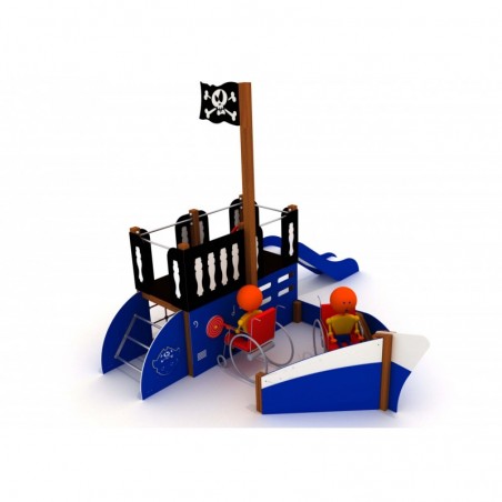 Structure de jeux Inclusifs "Bateau de PIRATES" adapté pour les PMR et accessibles pour les enfants en fauteuil roulant, avec panneau interactif, gouvernail de plate-forme, accès par échelle et filet d'escalade, sortie par le toboggan.