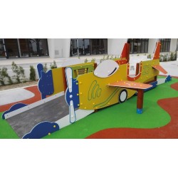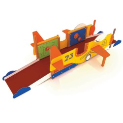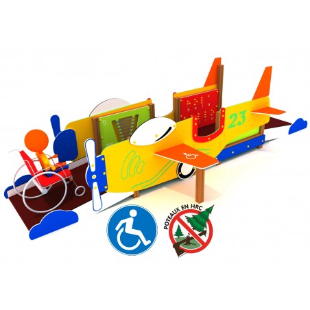 Une structure de jeu pour fauteuil roulant. Pour le plus grand plaisir des enfants. L’accès au poste de pilotage se fait par l’arrière. Une fois au milieu. l’utilisateur dispose de panneaux ludiques pour commander et diriger l’avion. La sortie se fait par l’avant.