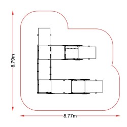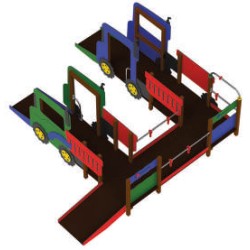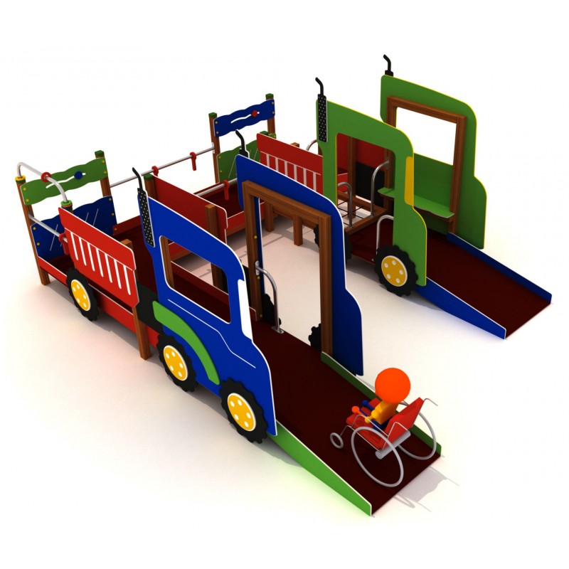Combinaison adaptée aux enfants valides et à mobilité réduite. Ces 2 camions sont accessibles par un pan incliné adapté aux fauteuils roulants. Les deux camions sont reliés à une passerelle interactive. avec des panneaux ludiques. également accessibles aux fauteuils par un pan incliné. Un des 2 camions est relié par un filet au sol.