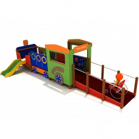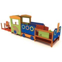 Ce train est adapté aux enfants valides et à mobilité réduite. La parfaite cohésion entre eux est réunie dans cette structure. Une grande passerelle inclinée adaptée aux fauteuils permet aux enfants de monter dans le train de la mine. 7 panneaux ludiques sont à disposition pour le plus grand plaisir des enfants ainsi qu’un petit toboggan.