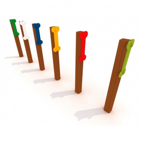 Poteaux en bois avec un élément décoratif en polyéthylène pour que l’animal s’exerce au slalom entre les poteaux.