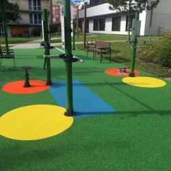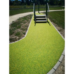 Réalisation de sol souple coulé sur site avec finition en EPDM coloré.
