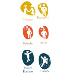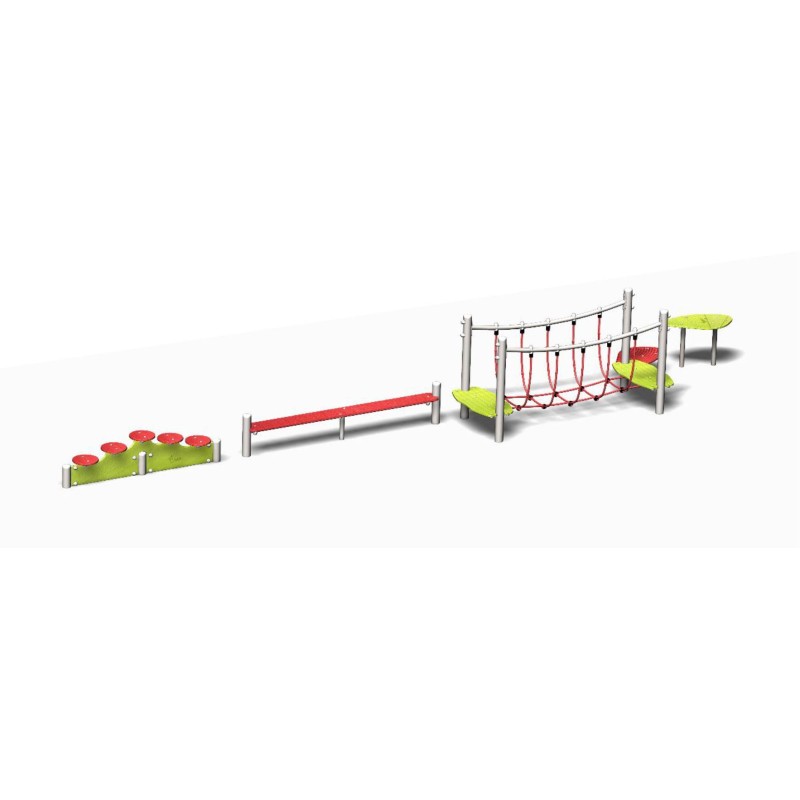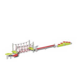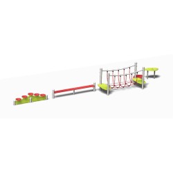 Ensemble composé de pas japonais, d'une poutre d'équilibre, d'un pont de corde, d'un parcours sur plateforme étagée.