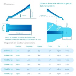 Hauteur latérale importante, offrant une sécurité accrue au départ du toboggan. Bords arrondis. Fabriqué d'une seule pièce grâce à la technologie RTM.