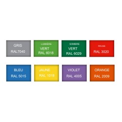 Coloris disponible : Rouge 3020, Vert foncé 6029, Vert clair 6018, Jaune 1018, Bleu 5015, Violet 4005, Orange 2009 et Gris 7040 et élément translucide.