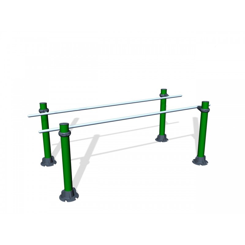 Le SPK33 comprend deux barres parallèles servant d’appui pour les usagers ayant des difficultés à marcher. Ce module Barres parallèles sert à réaliser divers exercices d’étirements, de marche et de souplesse Il est possible d’installer des dalles podo-tactiles au sol afin de procurer des sensations aux utilisateurs (graviers, herbe, sable etc.).