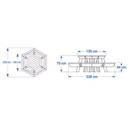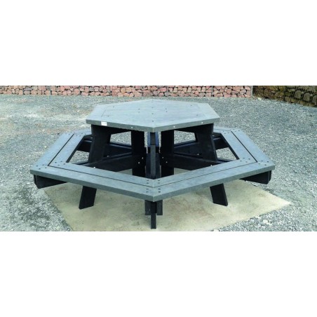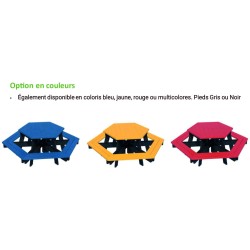 Table de pique nique hexagonale de diamètre 228 cm et de hauteur de plateau de 79 cm et d'assises de 44 cm