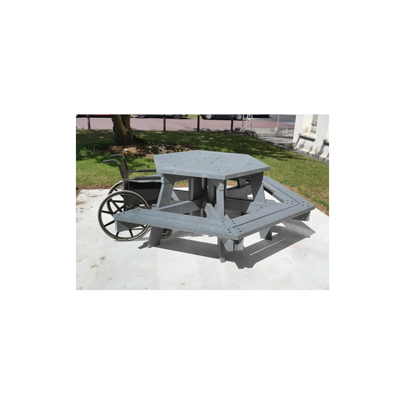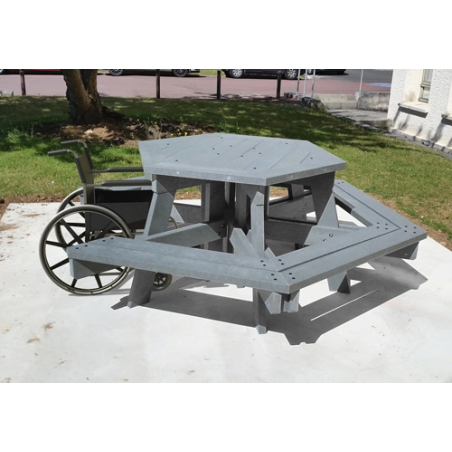 Table de pique nique hexagonale PMR de diamètre 228 cm et de hauteur de plateau de 79 cm et d'assises de 44 cm