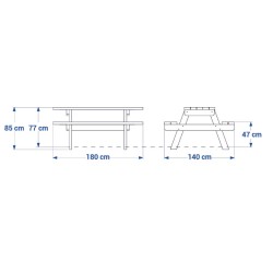 Table de pique nique longueur 180cm x 140 de largeur, de hauteur de plateau de 77 cm et d'assises de 44 cm