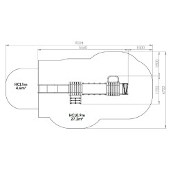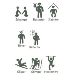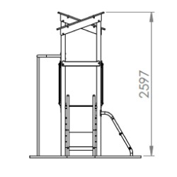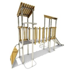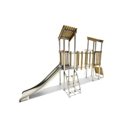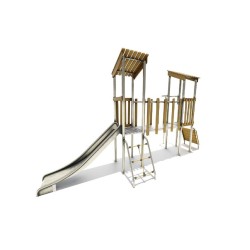 Ensemble composé de 2 tours avec un toboggan à glissière en INOX reliées par une passerelle rigide, d'un mât de pompier, d'un panneau avec prises de grimpe en robinier