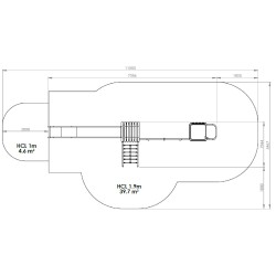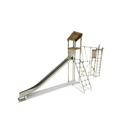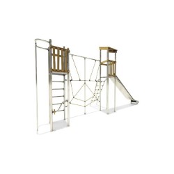 Ensemble composé de 2 tours avec un toboggan à glissière en INOX reliées par un filet de cordes armées vertical, d'un mât de pompier, d'une échelle,