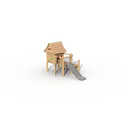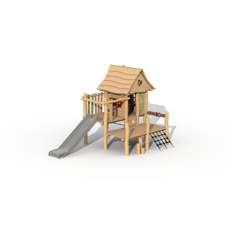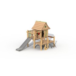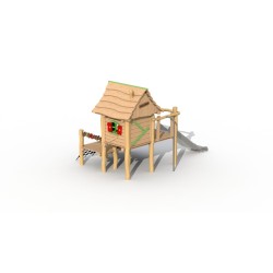 Maisonnette surélevée avec une terrasse et un toboggan en inox