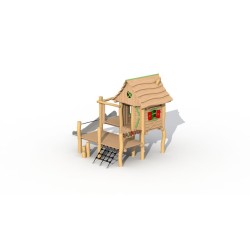 Construit en robinier et mélèze. La terrasse est accessible par 3 pas-de-géant ou un petit filet à grimper.