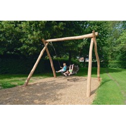 La balançoire est en robinier. La nacelle a un diamètre de 125 cm et est composée de câble de traction (6 pièces). La nacelle est attachée à des crochets exempts de maintenance à l’aide de cordes de traction doubles. La balançoire doit être ancrée directement dans le sol avec du béton.