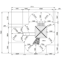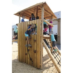 Les planchers et les planches de la toiture, du mur d’escalade et des parois latérales sont faits en mélèze, le reste est fait en robinier. La tour est à atteindre par 2 murs d’escalade avec des prises d’escalade et un filet à grimper + une structure d’escalade comprenant des rondins et des cordages en câble d’acier. On peut descendre la tour par un toboggan en inox.