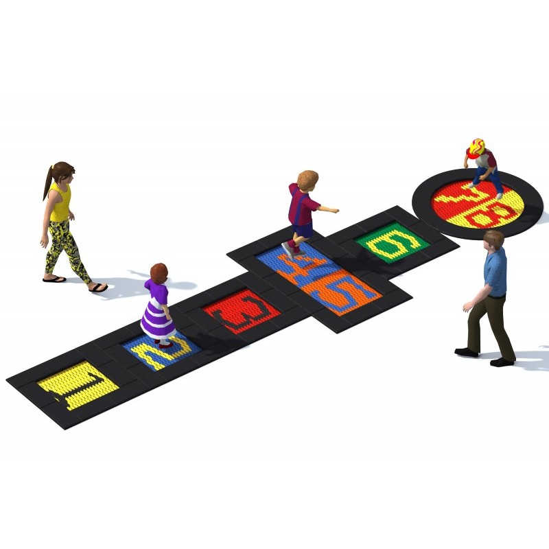 Ensemble de 6 trampolines destinés à être utilisés sur des terrains de jeux à usage intensif. Le set se compose de 4 trampolines de forme carrée, 1 trampoline en forme de rectangle et 1 trampoline rond
