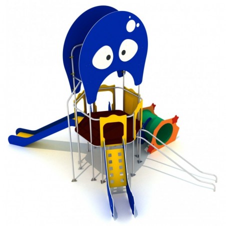 Très jolie structure tubulaire en acier inox habillée de HDPE. On accède à la passerelle en grimpant à l’aide de l’échelle de corde ou du panneau perforé incliné. Pour descendre. les enfants ont le choix entre le toboggan classique ou la rampe tubulaire de glisse ou utiliser le mât de pompier. Au sol un petit tunnel pour jouer à ramper.