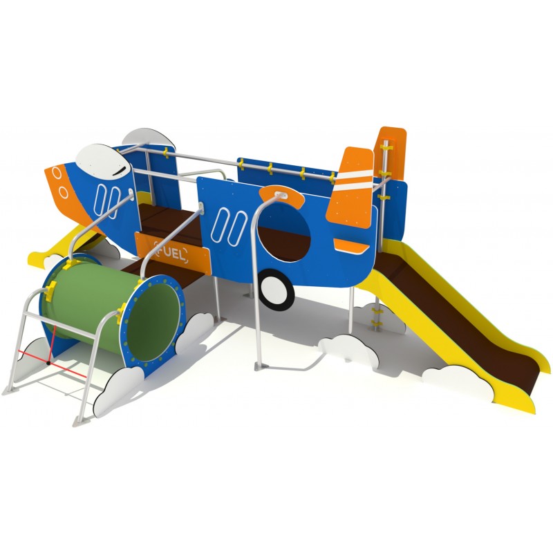 Une création originale d’un petit avion qui semble voler au dessus des nuages où les enfants pourront monter à bord en passant par dessus les 2 “réacteurs” tunnels. Une fois à l’intérieur. ils disposent de 2 toboggans et d’un mât de pompier pour redescendre.