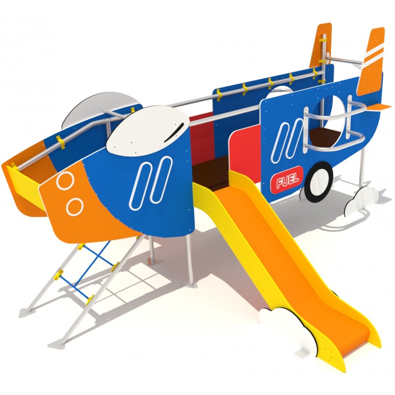 Un petit avion où les enfants peuvent monter à bord en passant par l’avant. en escaladant l’échelle de corde. Arrivés à l’intérieur. ils disposent ensuite de deux toboggans pour la sortie. d’un mât de pompier et de deux hublots protégés par des barres inox.
