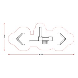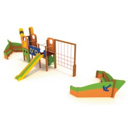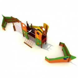 Très bel ensemble de 3 structures de jeux formant un grand bateau pouvant accueillir une vingtaine d’enfants. A l’avant et à l’arrière. de grands bancs pour se raconter des histoires. Au centre. un grand filet de grimpe vertical et un filet incliné permettent d’accéder à la grande structure sur laquelle se trouvent de nombreux panneaux passe tête pour les photos. Une fois sur la plateforme. la descente peut se faire soit en utilisant le toboggan. soit le mât de pompier.