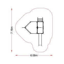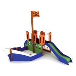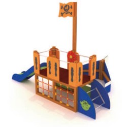 Petit bateau de PIRATES. On accède à la passerelle de navigation en grimpant à l’aide de l’échelle tubulaire inclinée. ou le filet tunnel de grimpe vertical ou en utilisant les panneaux perforés verticaux qui sont face au pont. La descente se fait par le toboggan. Les enfants peuvent aussi aller sous la plateforme pour se raconter des histoires.