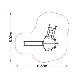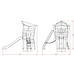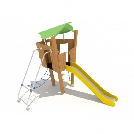 Tour en structure bois avec panneaux PEHD pour l'habillage et le toit de grandes dimensions avec accès par filet à grimper et échelle inox avec corde et toboggan de sortie.