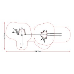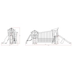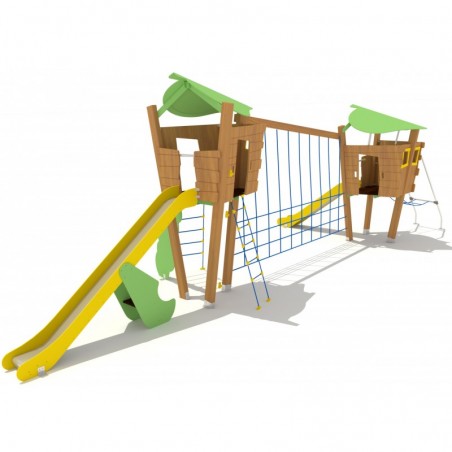 2 grandes tours à structure en bois avec panneaux PEHD et toit en HDPE avec accès par filet d'escalade, échelle en acier inoxydable, mur d'escalade, toboggan, poteau de pompier et grand filet de corde entre les 2 tours.