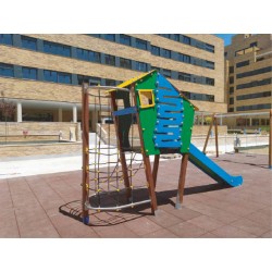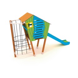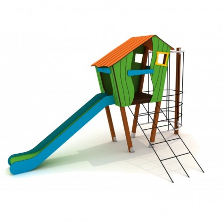 lCabane perchée avec son toboggan. L’accès à la plateforme se fait à l’aide du filet tunnel de grimpe vertical. ou du filet de grimpe incliné. Les enfants disposent d’un abri pour ensuite redescendre en utilisant le toboggan.