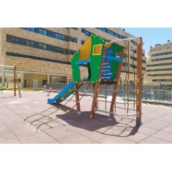 Une cabane de jeu perchée pour les enfants de 5 à 12 ans avec une échelle de corde, un filet vertical pour grimper et un toboggan pour descendre.