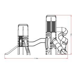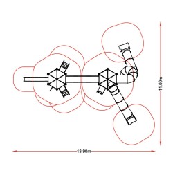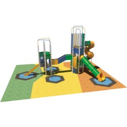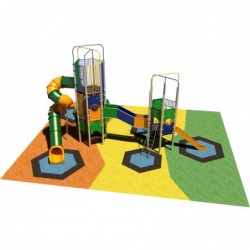Très belle structure de 2 tours reliées par une passerelle à 2 niveaux. Un jeu de parcours et d'escalades pour atteindre un premier toboggan tubulaire au 2e niveau ou alors le plus grand toboggan tubulaire situé au 3e niveau. Pour y parvenir il faudra monter l’une des 2 échelles tubulaires, emprunter la passerelle et grimper dans la grande tour. Depuis la première tour les enfants peuvent utiliser le toboggan ou le mât de pompier pour descendre.